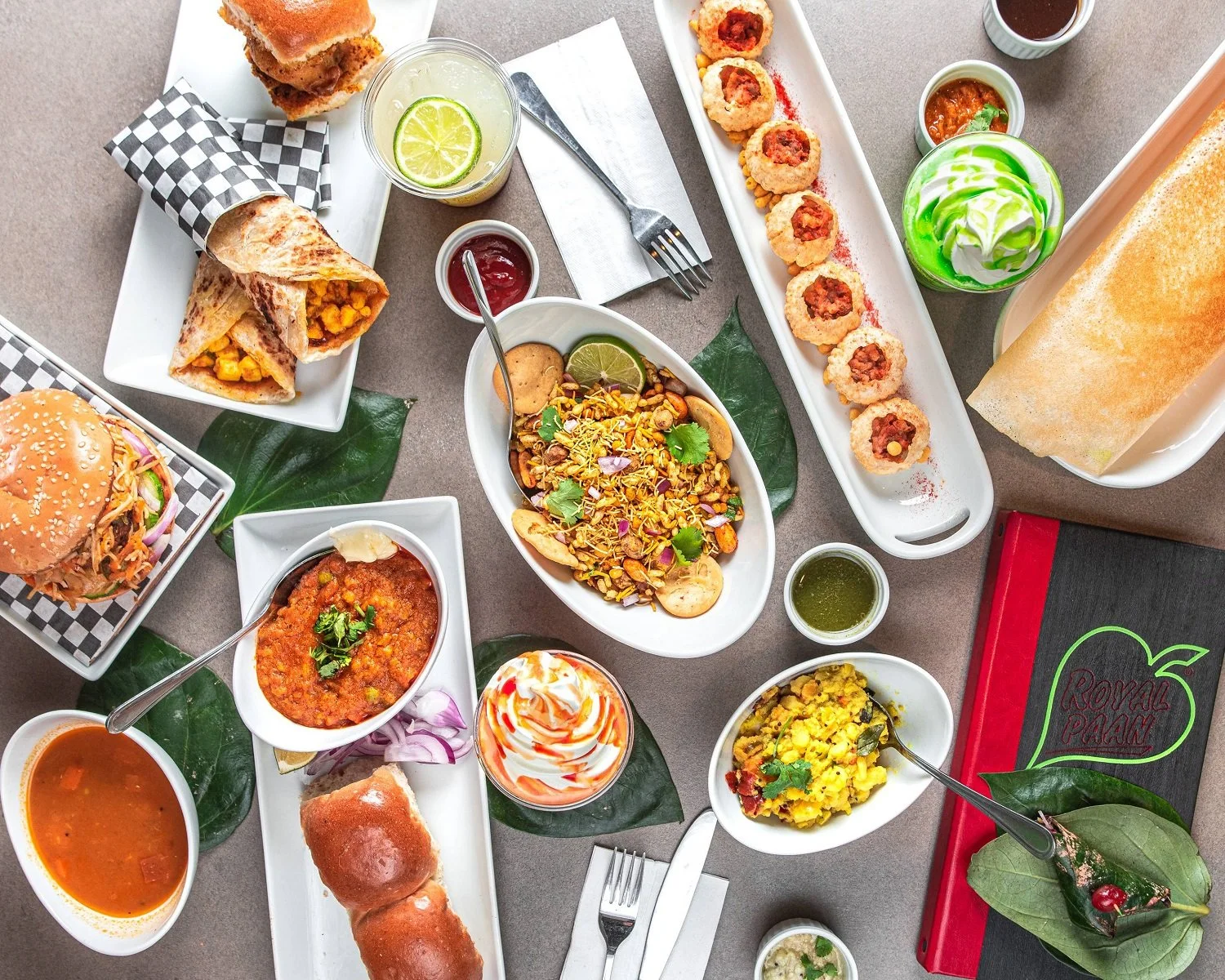 Two Indian street food restaurants in Edmonton — Royal Paan Tamarack in southeast Edmonton and Punjaabi by Royal Paan in Downtown — serving dine-in, takeout, delivery, and catering daily